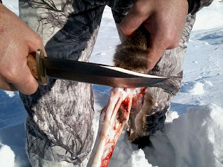 Prave vrline sječiva dolaze do izražaja tek u dodiru sa divljači. Na fotografijama se može vidjeti da nož siječe dlake po sredini. Imam osjećaj da bih njim mogao naoštriti dlaku! Rezovi duž kože su precizni i čisti. Zglobove presijeca po tetivama. Kod odsijecanja glave divljači primjećujem da oštar piramidalan vrh lako nalazi pravac izmedju kičmenih pršljenova.
